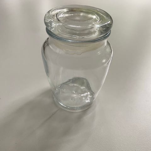Glas beholder, buttet med glaslåg, fin stand, ingen skår eller revner. Højde 20 cm med låg, dia i bunden 13 cm.