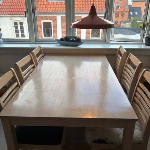 Sammenklappeligt spisebord med 4 stole til med høj tremmeryg.
