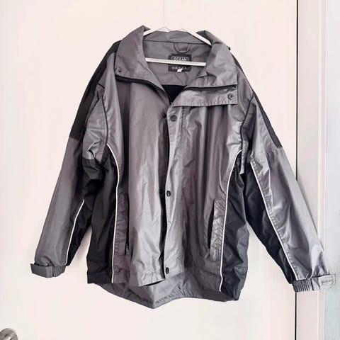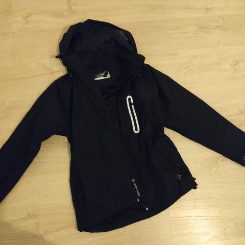 Hvid og lyserød regnjakke fra mono i str. 12 med to lommer foran med lynlås