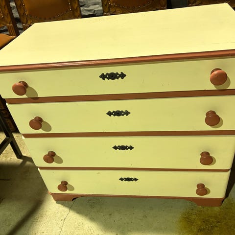 Kommode med smuk gammel bemaling 5 skuffer med højde af 16 cm og en skuffe med 7 cm højde. 128 cm bred 62 cm dyb og 133 cm høj. Fast pris
