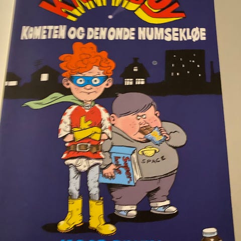 Karmaboy børnebog på dansk med titlen 'Karmaboy: Knudser og den onde numseklub'. Bogen indeholder illustrationer og fortælling rettet mod børn, med humoristisk indhold og karakterer. Formatet er en fysisk bog med farverige omslag og sider.