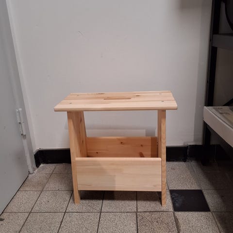 Med den simple Woodrow opbevaringsstol (eller opbevaringsbord) fra Umbra får du et møbel med mange anvendelsesmuligheder. Stolen kan bruges til opbevaring, sidebord, børnebord, sofabord, taburet, skammel eller til at sidde på (max. 120kg), som gør den ideel til studieboligen eller det minimalistiske hjem. Toppladen er hvidmalet og selve bordet er af formspændt lyst træ - måske birk eller bøg. Standen er fin med enkelte brugsspor.