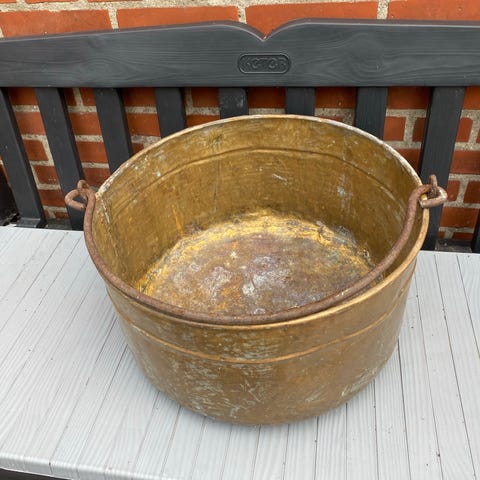 Læder/læderlook ved det ikke helt, men fin og flot og i rigtig god stand til brænde eller blade. Stor oval størrelse L:49 cm B: 34 H: 35 Sender gerne efter aftale