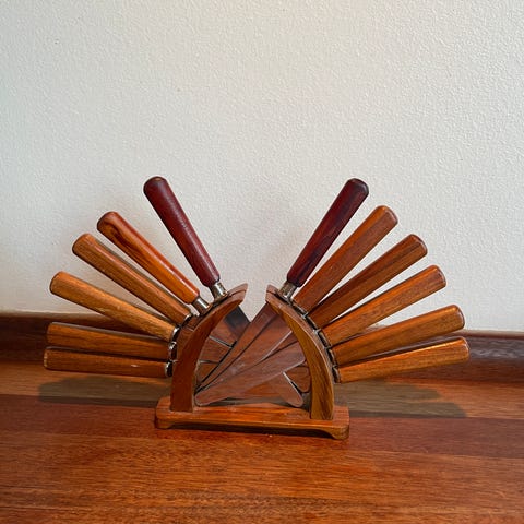 Bestik, Retro knivbræt, Retro knivbræt med tre knive. Træ med indsat klinke. Knivene trænger til slibning.