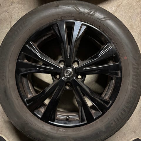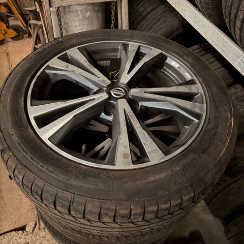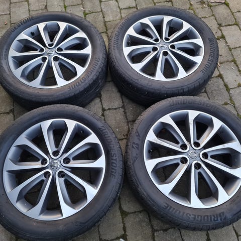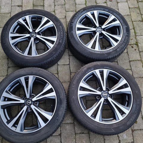 Flot og velholdt sæt originale 18" Nissan alufælge med monterede Goodyear EfficientGrip Performance sommerdæk.