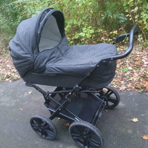 Har denne skønne Odder vogn med specialfremstillet letvægtsstel så vognen ikke vejer så meget. Der følger en baby dyne evt. dynebetræk, regnslag, samt baby sele med. Den er med langt liggemål. Den har altid stået inde når baby ikke har sovet i den og ellers i læ hvis det har regnet imens baby var i. Så den har ingen fugtskader.