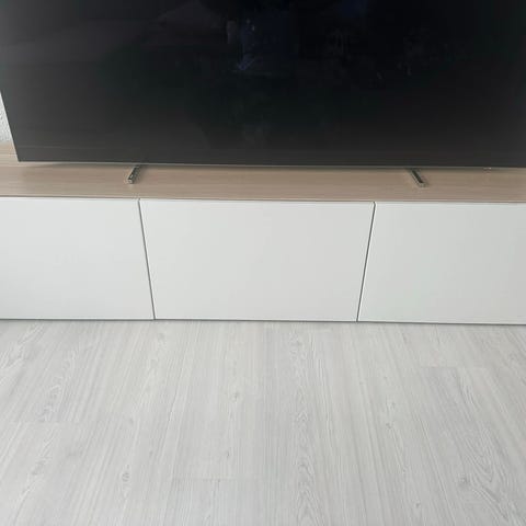 Sælger et velholdt IKEA BESTÅ tv-bord med hvid ramme og smukke salvie grønne låger – en populær og trendy farvekombination der passer perfekt til det moderne skandinaviske hjem. Mål: 180 × 42 × 38 cm med god opbevaringsplads bag tre låger. Fremstår i meget pæn stand uden synlig slitage. Samlet og klar til brug.