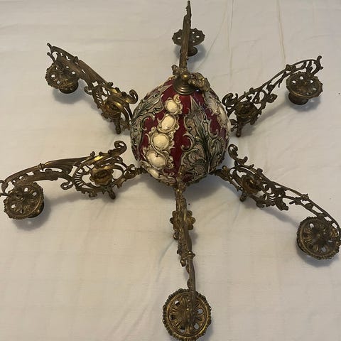 De 4 pyntearme, der oprindeligt var på lysekronen, er fjernet pga. skader, men det ses ikke, når kronen hænger i loftet, og den er næsten smukkere uden dem. Kuplen for neden er skadet på den ene side, som det ses på det sidste foto.