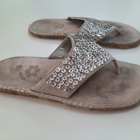 Slip-in sandaler med smalle fodremme og beklædt blokhæl (4.5 cm høj). Riflet sål på undersiden. De passer desværre ikke min fod, derfor må de videre.