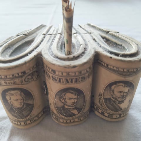 Oprindeligt har der siddet låg på toppen af søjlerne, disse haves ikke længere. Men man kan stadig “låse” pengene inde, ved at føre en kæde igennem hullerne i søjlerne og bruge en hængelås - som det oprindeligt var gjort. (Kæde og hængelås følger ikke med)
