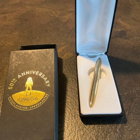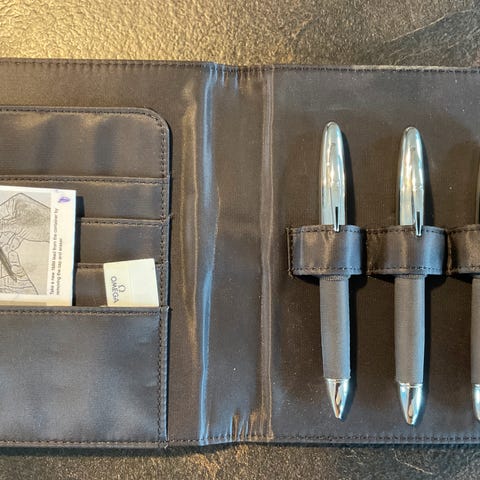 Sælger ud af min Omega samling af diverse penne. Her min orange læder notesblok med pen (Fischer Pen). Fischer-penne kan skrive i frostvejr/undervand. Pen i blank stål med rumfærge i guld. Alt er originalt. Sendes for købers regning.