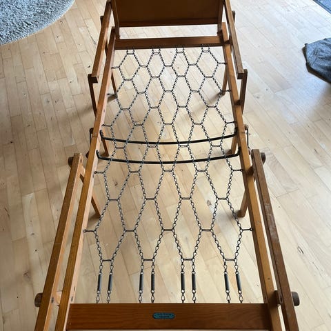 Kan bruges som hamonika/harmonika seng eller som folde liggestol til haven.