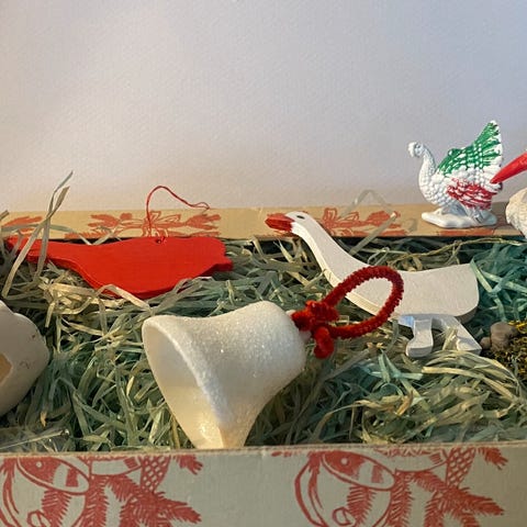 juleklokker i messing, gamle glaskugler og julepynt fra Daells Varehus.