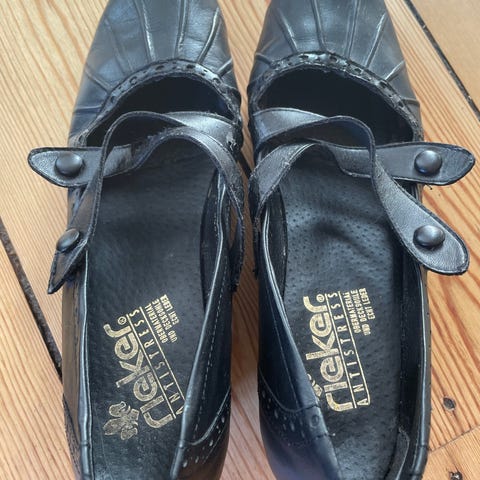 Et par søde Rieker heels. Størrelsen er 39. Standen er god, skoen har enkelte brugsmærker. Læderet er uden ridser og mærker. Materialet er læder. Farven er sort.