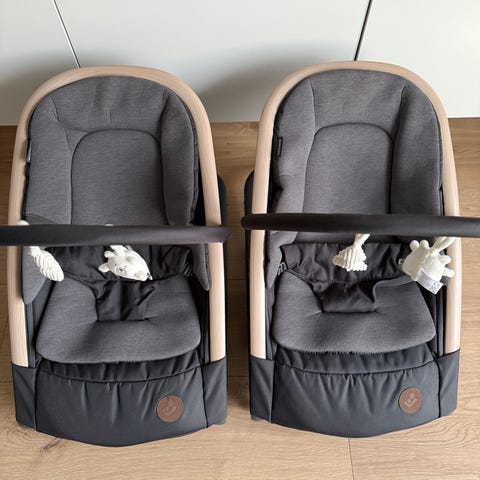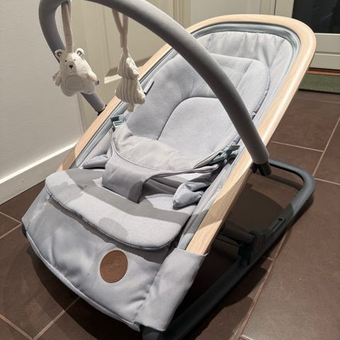 Maxi-Cosi skråstol til baby i grå. Standen er god men brugt. Der er enkelte pletter på stolen som vist på billede, jeg er overbevist om at de kan komme af i vask.