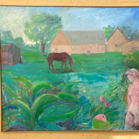 Oliemaleri, Arne Rafn Jacobsen Tejn , motivmed kvinde og panda, olie på lærred,Bornholms kunsthandel,kan sendes efter aftale, 8/10