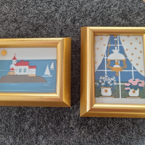 Disse norske minibilleder på 14x11 cm, var meget populære samleobjekter da de var i salg på 80-tallet. De er igen svært populære retroobjekter og det kan være svært at finde billeder der rammen er 100% hel og pen.