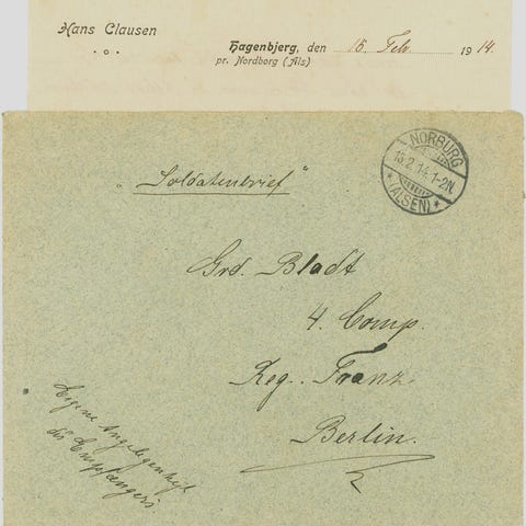 Ekstremt sjældent marinefeltpostbrev i perfekt stand fra Treårskrigen 1848-50 sendt af løjtnant Frederik Ludvig Holbøll, adjudant for Eskadrechefen, til sin søster Ludviga Holbøll, Academigaden (i dag Fredericiagade), Kjøbenhavn. Brevet er dateret Sønderborg d. 10. september (1849). Bagsiden viser kartenummer 1 og porto 4 rbs., der blev opkrævet hos modtager. Desuden ses et rødkridtskryds, der formentlig betyder, at brevet blev godkendt som militærbrev. Løjtnant Holbøll var med på linieskibet Christian VIII i slaget ved Eckernförde i april 1849.