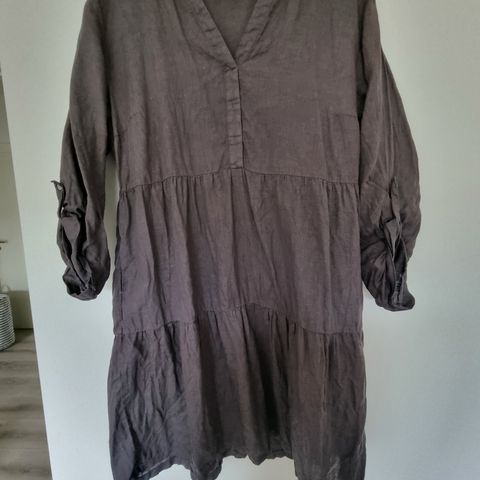 Ellos sort skjortekjole str 50-52. Brystmål 2x60 cm og længde 101 cm. Kjolen kan ikke knappes op foran. Matr 96% polyester og 4% elastan