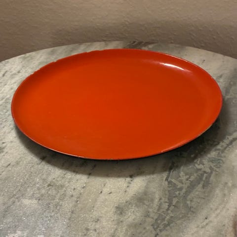 En fin rød / sort Ørskov melamin bakke. Diameter 26,5 cm. Stemplet Orskov. God stand med ganske få brugsspor (få minimale ridser).