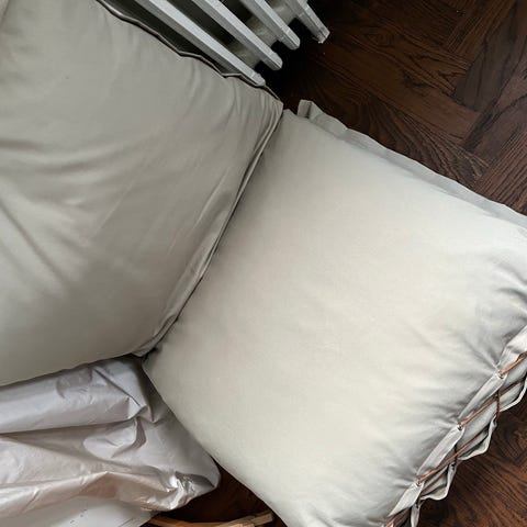 Sandfarvet lænestol med tilhørende fodskammel, købt hos Newport. Desværre er det et fejlkøb.