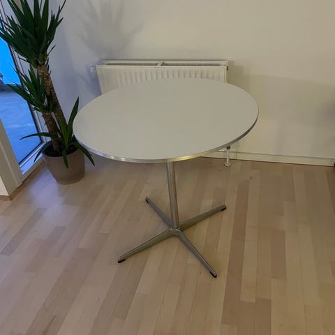 Fint cafebord / spisebord fra Fritz Hansen designet sf Arne Jacobsen. Fremstår i rigtig Pæn stand med serienr. Måler 75 cm i diameter og 72 i højden.