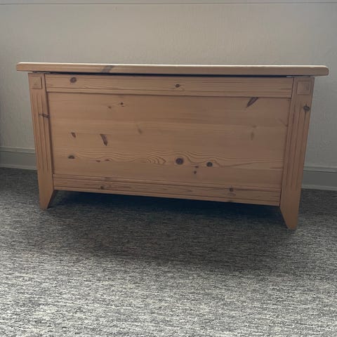 Pileflettet stor kiste med låg der lukkes med læderremme. Meget velholdt.