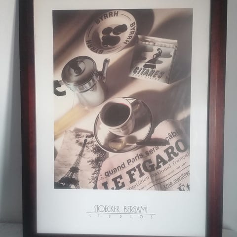 Sort-hvid fotoplakat af Café des 4 Vents i Montmartre, Paris (1950) af fotograf René-Jacques. Flot motiv, professionelt indrammet med wireophæng. Glas mangler. Perfekt til fransk-inspireret indretning.