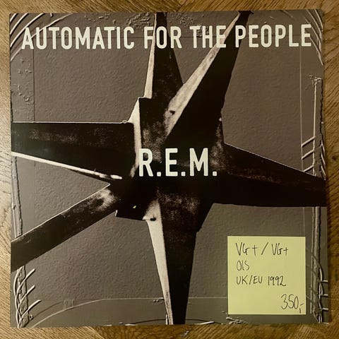 R.E.M. – Automatic For The People , us 1992 , sjælden, på side 1 nummer nr 5 høres en hair lines lidt , resten spiller ex´+ 1200 KR SOLGT