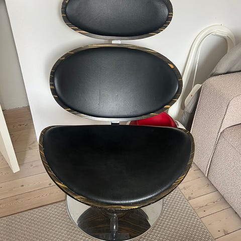 Stolen er betrukket med slidstærkt sort læder, som giver et elegant og tidløst udtryk. Det solide drejestel i børstet stål tilfører en moderne industriel kant og gør det nemt at orientere sig i rummet uden at rejse sig. Den runde sædehynde og det polstrede ryglæn sikrer høj siddekomfort – også ved længere ophold.