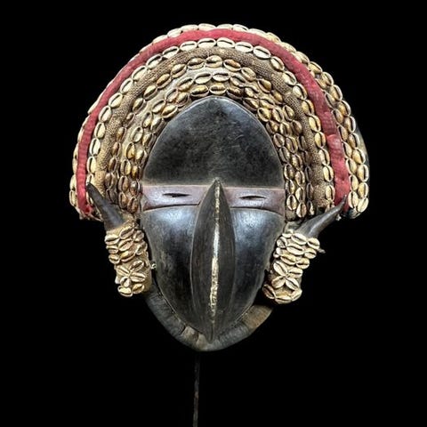 Virkelig meget gammel maske med guld og sølv maling og masser af patina. Den kan hænge på væggen. Stammer fra Tibet eller Nepal. Ved ikke meget om den slags - men har søgt oplysninger på nettet. Måske det er en eksorcist- maske.