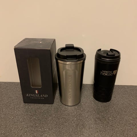 2 specialfremstillet krus med tryk - blå med sort hjerterytme-tryk og Fjordhest. Begge er helt nye og ubrugte. Kan sendes.