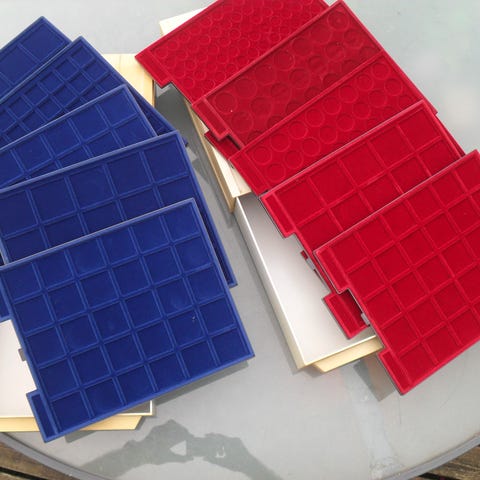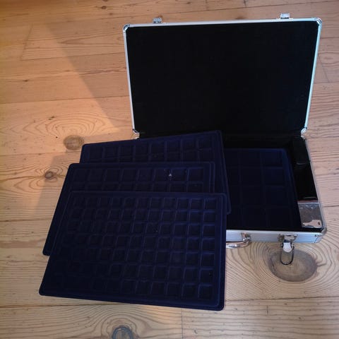 Aluminium mønt kuffert med 3 bakker og nøgler. Med metalhjørner og 4 plastikben.
