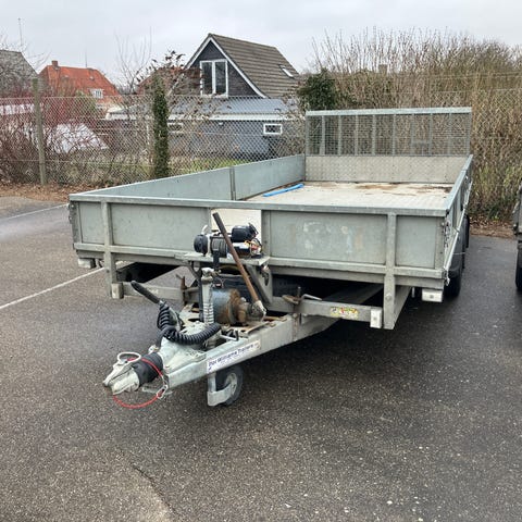 Pæn og velholdt Vippelads trailer med manuel pumpe, alu bund, 6 stk. surringsøjer og sider og rampe.