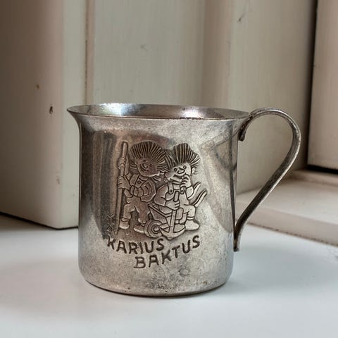 Sjældent og charmerende dåbskrus i sølvplet med motiv af de elskede figurer Karius og Baktus. Et nostalgisk minde fra barndommen og et oplagt samlerobjekt eller dåbsgave med personlighed.
