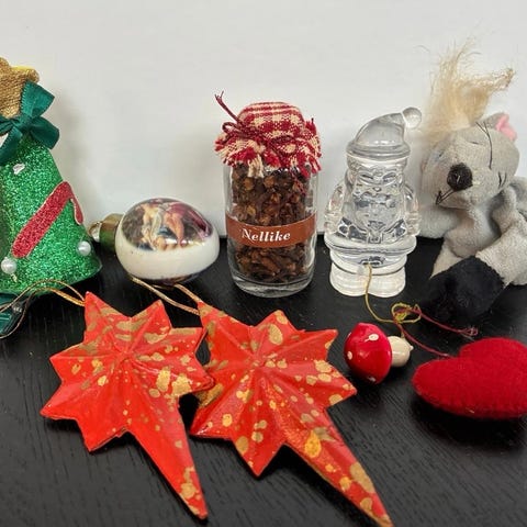 80'er julepynt, Når julen skal være med plastik-bling fra 80'erne. Tre af ophængene kan åbnes og alle kan hænges op med perlekæderne.