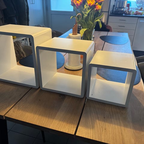 5 "kasse" til reol, som kan stables på mange måder afhængig af behov. Vi har brugt dem på børneværelset, hvor det har fungeret super godt at kunne "bygge om" afhængig af alder og behov. Er lavet i MDF og trænger til lidt maling, men er super stabile. Prisen er for 5 stk.