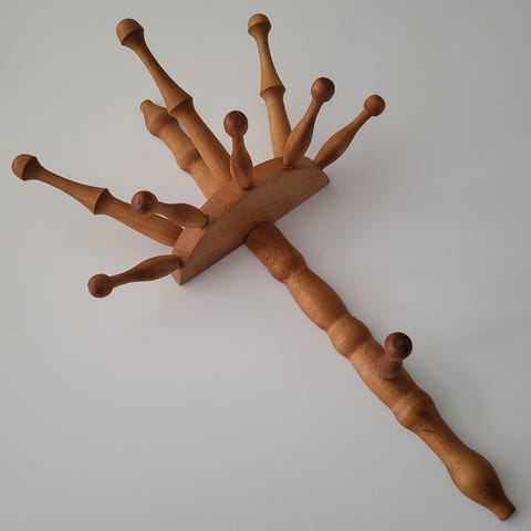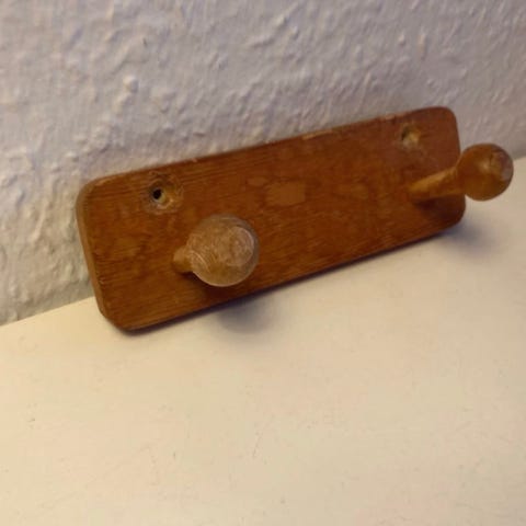 Ældre knagerække i træ med ialt 7 træknager. Knagerækken måler 38 cm i længden og har fastmonterede ophæng, så den er nem at montere.
