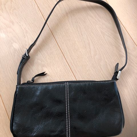 Lille (12 x 14 cm), sort taske i læder med 3 rum og lang rem, så den kan bæres som cross over. Ideel til rejsekort, penge m.m på en udflugt.