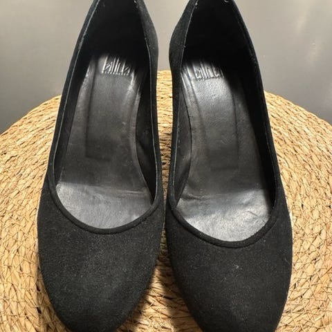 Med kroko-detaljer og rem over ankel. Brugt få gange, super velholdt. Sort ruskind.