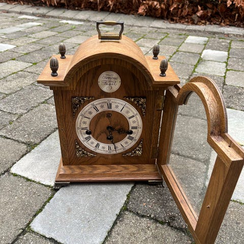 Elegant standur med klassisk design, mørkt bejdset træ og messingdetaljer. Ursiven er signeret “K. Nielsen” og bærer “Tempus Fugit – Roskilde” emblemet. Mekanisk urværk med pendul og kædetræk – medfølger. Uret fungerer perfekt og har stået i et røgfrit hjem.
