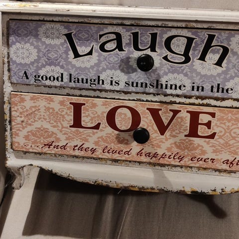 lille kommode med 2 skuffer. De kører ud når man trykker på dem