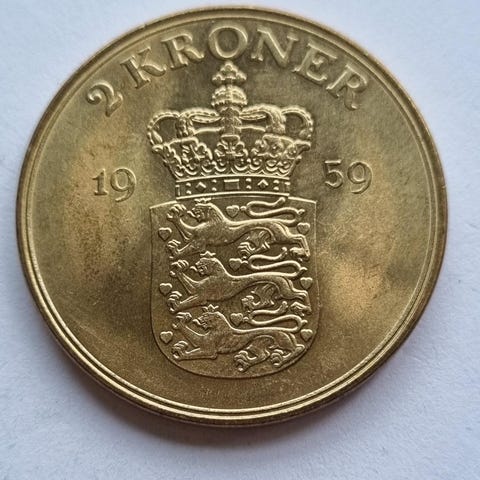 Her får du en pæn 2 krone fra Danmark 1959 i kval 01.