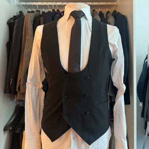 Dobbeltradet vest med floral struktur. Kun brugt få gange. Størrelse 38. Dvs. medium. Flotte detaljer på bagsiden. Uld/polyester blanding. Den er fra noose & monkey