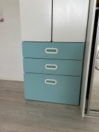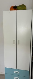Småstad/platsa garderobeskabet har tre skuffer (en mere indeni), en garderobestang og en hylder. Det er i meget god stand.
