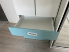 Dette garderobeskab tilbyder rigelig opbevaringsplads, selv i trange rum. Alle hjørner af døren er blødt afrundede, og døren har hængsler, der lukker lydløst. Skuffeudtrækkerdesignet sikrer, at skuffen lukker blødt, når den åbnes.