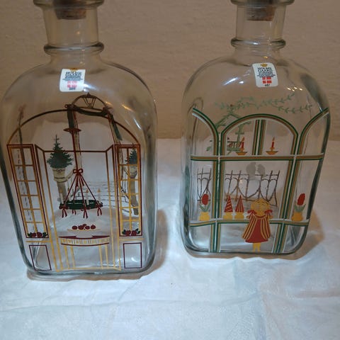 Glas, dramflaske, Holmegaard, jule tema. Kan ikke huske årstallet.