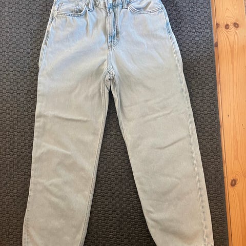 Velholdte jeans fra H&M i flot mørkegrøn/olivengrøn med læder look. Brugt få gange.