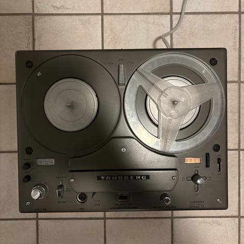Spolebåndoptager Tandberg i teak træ der nok trænger til en gang oile men båndoptageren virker og båndet der følger med er det dansk top musik