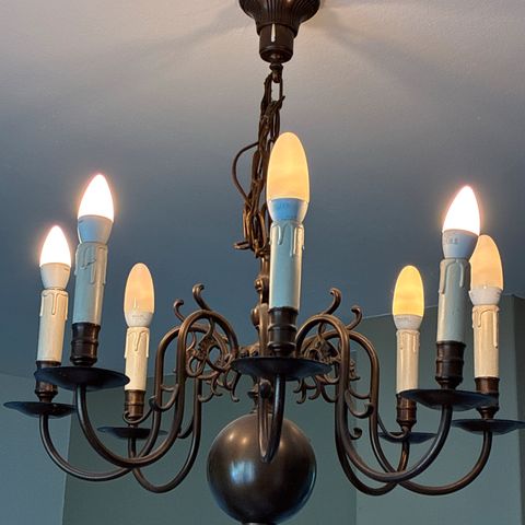 Fin, gammel lysekrone med stearinlys fatning på armene.